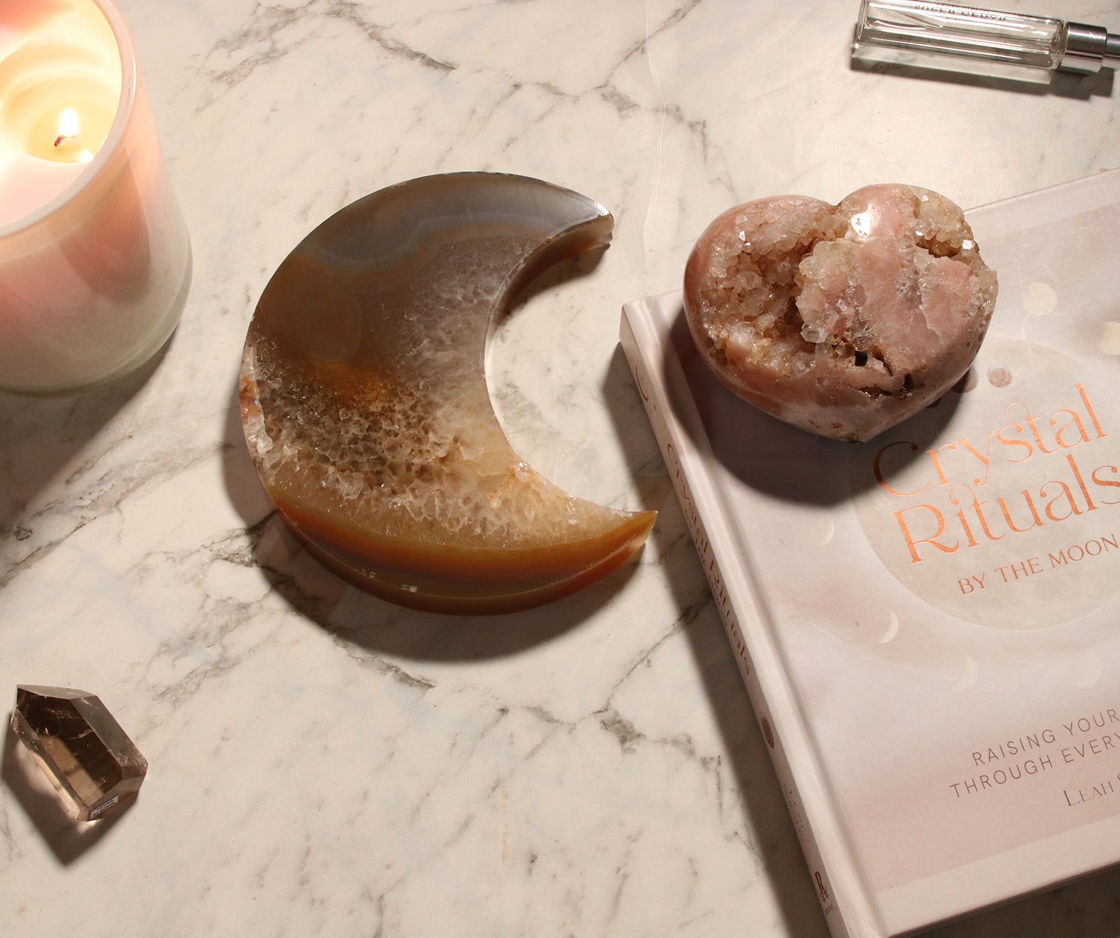 The Agate Moon crystal embodies the flow of the water element, making it a perfect energetic match for fire signs seeking emotional balance. Known for its ability to cleanse and stabilize the aura, Agate helps transmute anger into peace and invites a deeper sense of focus and calm. Its lunar shape is an ode to moon cycles, making it ideal for moon rituals and meditation.