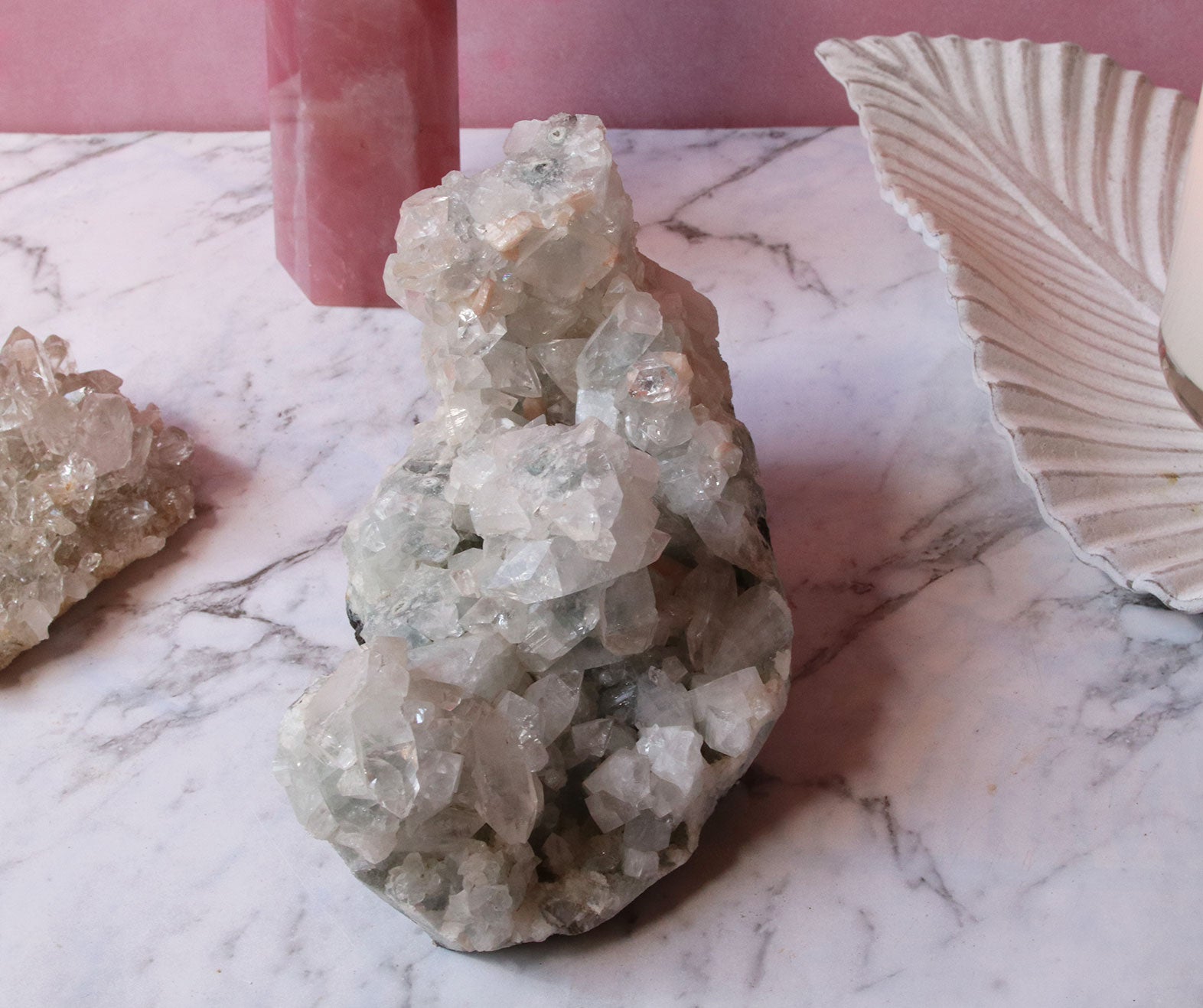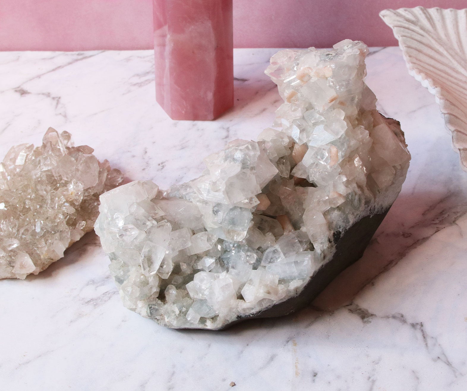 The Apophyllite is a soul star crystal where it helps balance both your masculine and feminine energies. It allows you to embody the flow of water with its calming, serene energy. It's high vibration connects you to the angelic realm and clear blockages for you to access more of your intuitive abilities.