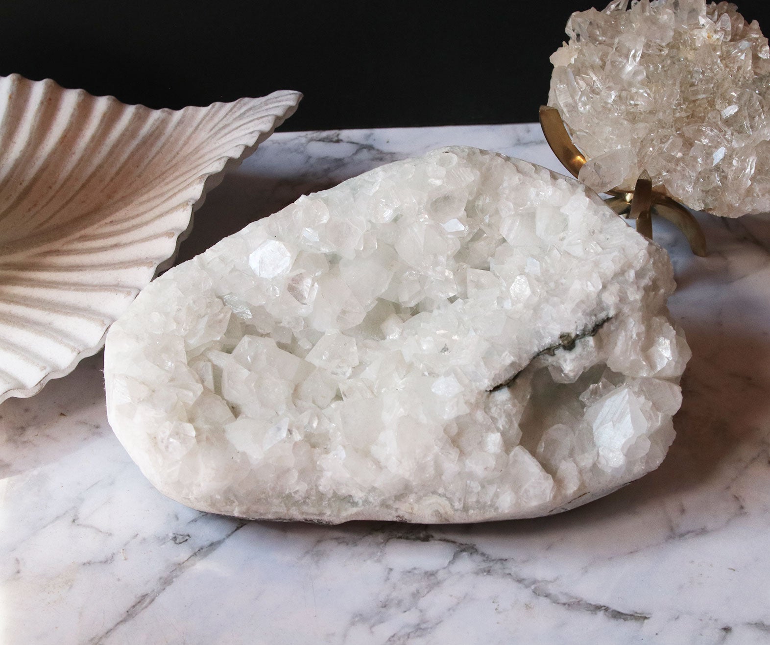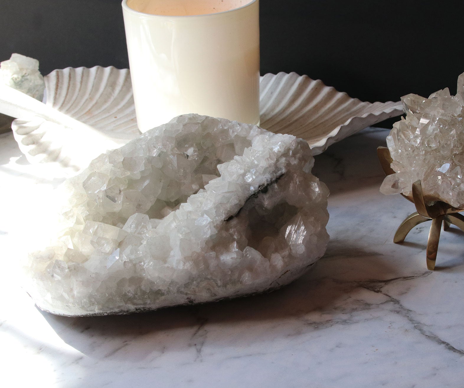 The Apophyllite is a soul star crystal where it helps balance both your masculine and feminine energies. It allows you to embody the flow of water with its calming, serene energy. It's high vibration connects you to the angelic realm and clear blockages for you to access more of your intuitive abilities.