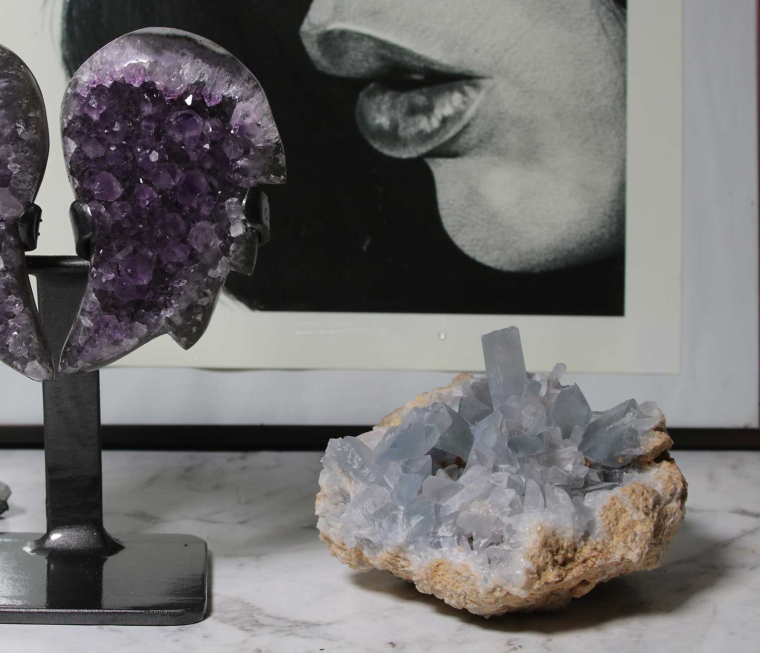 Celestite crystal is used for communication as it gently infuses your heart chakra with loving energy, easing any discomfort and pain. The Celestite stone activates your third eye and brings loving messages from the angelic realms. It acts like a portal. The stone has the ability to give you instant healings and clear your auric field. Simply just hold it in your hand and receive.