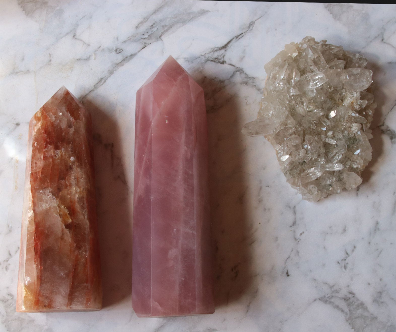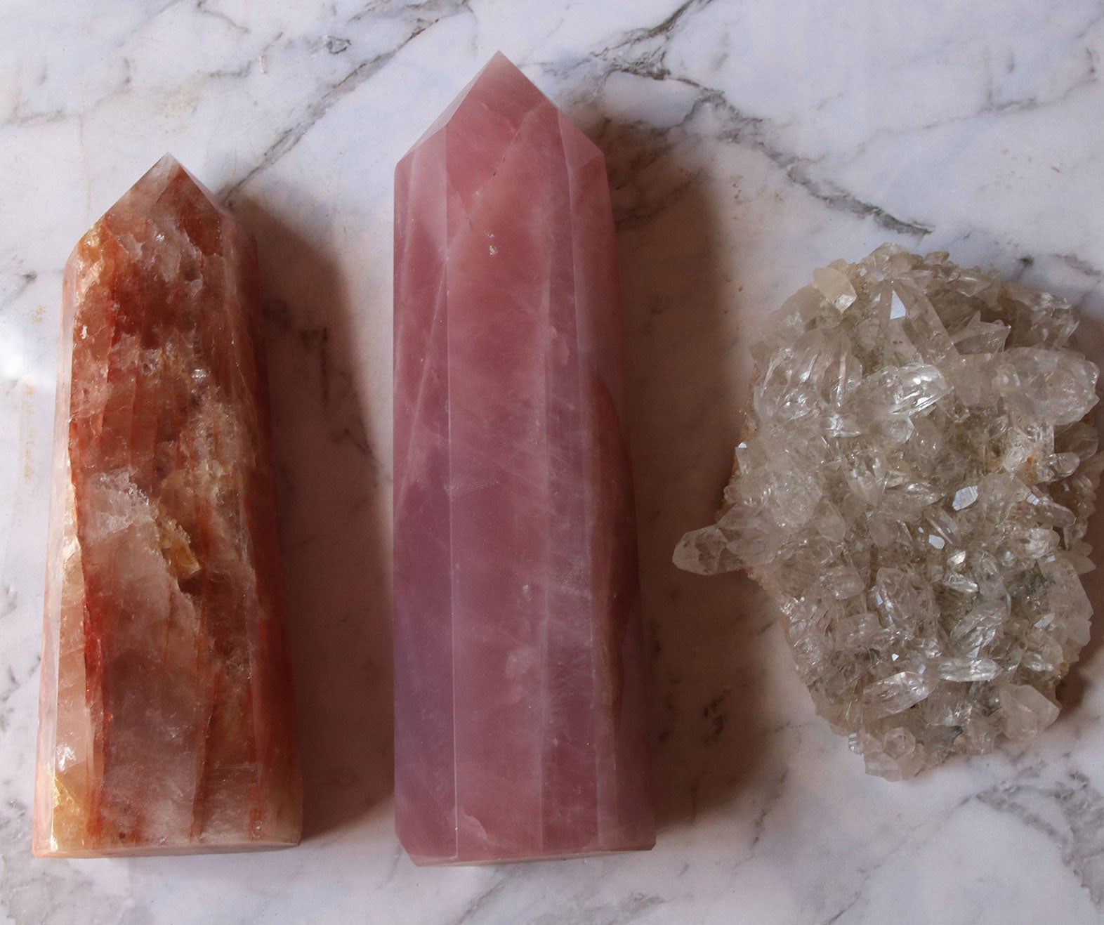 This set includes a Fire quartz, Rose quartz and Himalayan cluster.